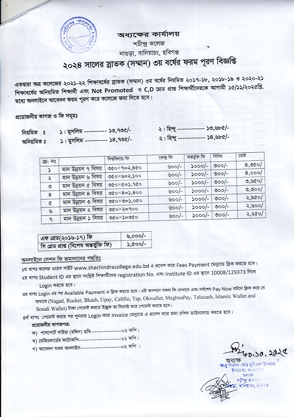 স্নাতক (সম্মান) ৩য় বর্ষ ফরম পূরণের নোটিশ
