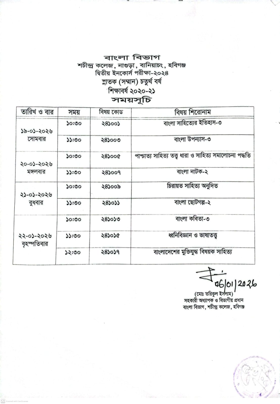স্নাতক (সম্মান) ৪র্থ বর্ষের ২য় ইনকোর্স পরীক্ষা রুটিন-২০২৪ (বাংলা বিভাগ)