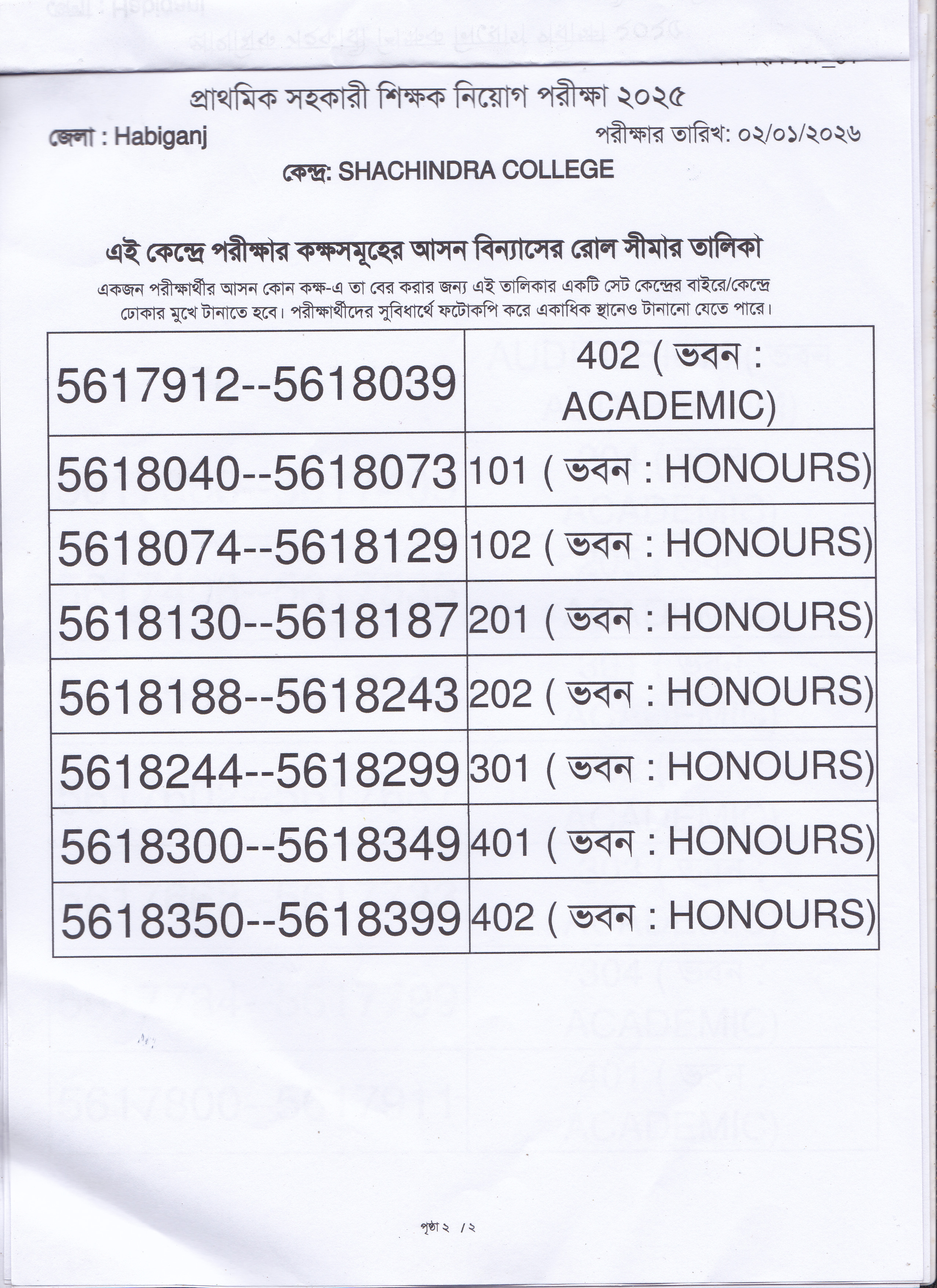 ০৯/০১/২০২৬ খ্রি. তারিখের প্রাথমিক সহকারী শিক্ষক নিয়োগ পরীক্ষা-২০২৬ এর আসন বিন্যাস। কেন্দ্রঃ শচীন্দ্র কলেজ