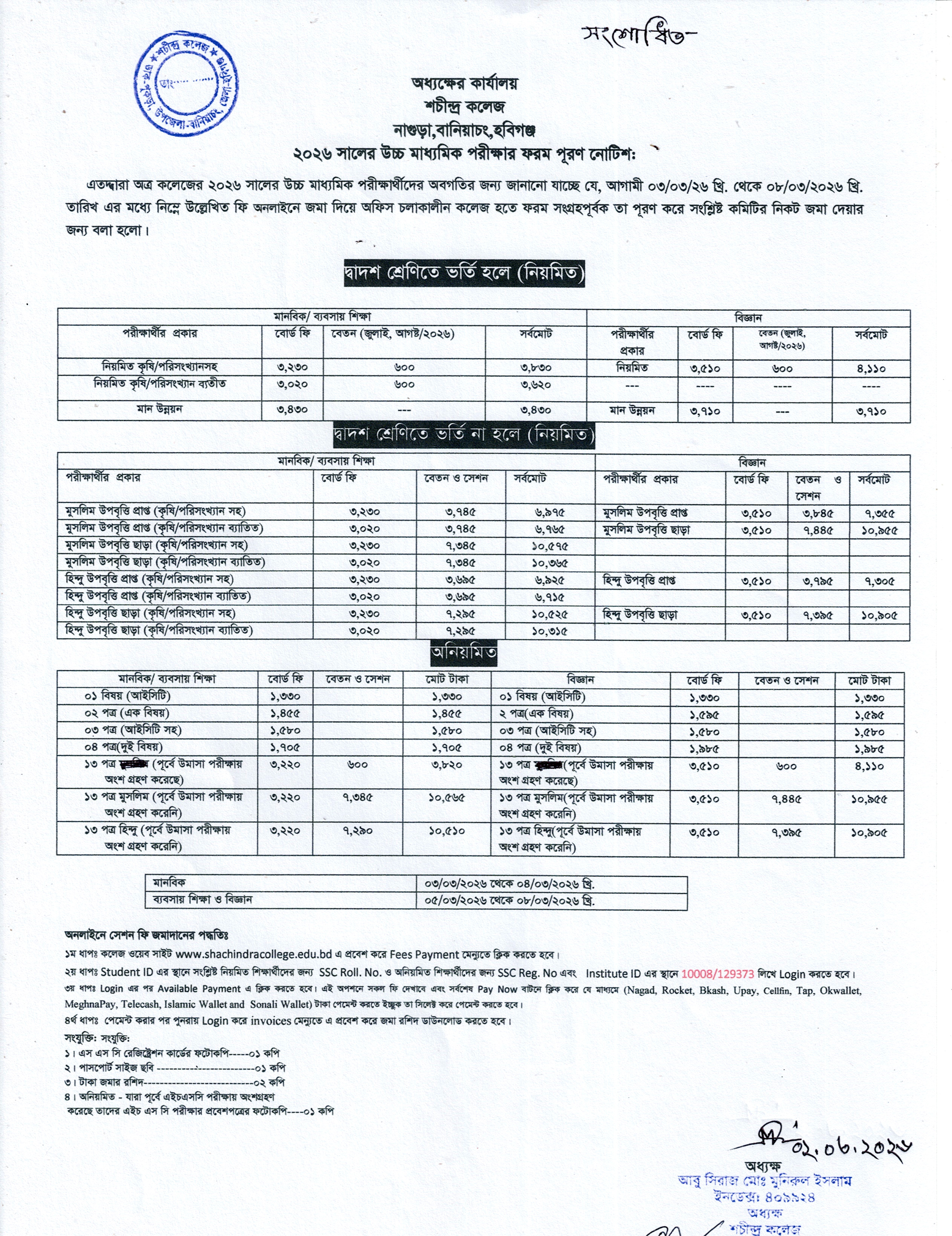 ২০২৬ সালের এইচ এস সি পরীক্ষার ফরম পূরণের নোটিশ