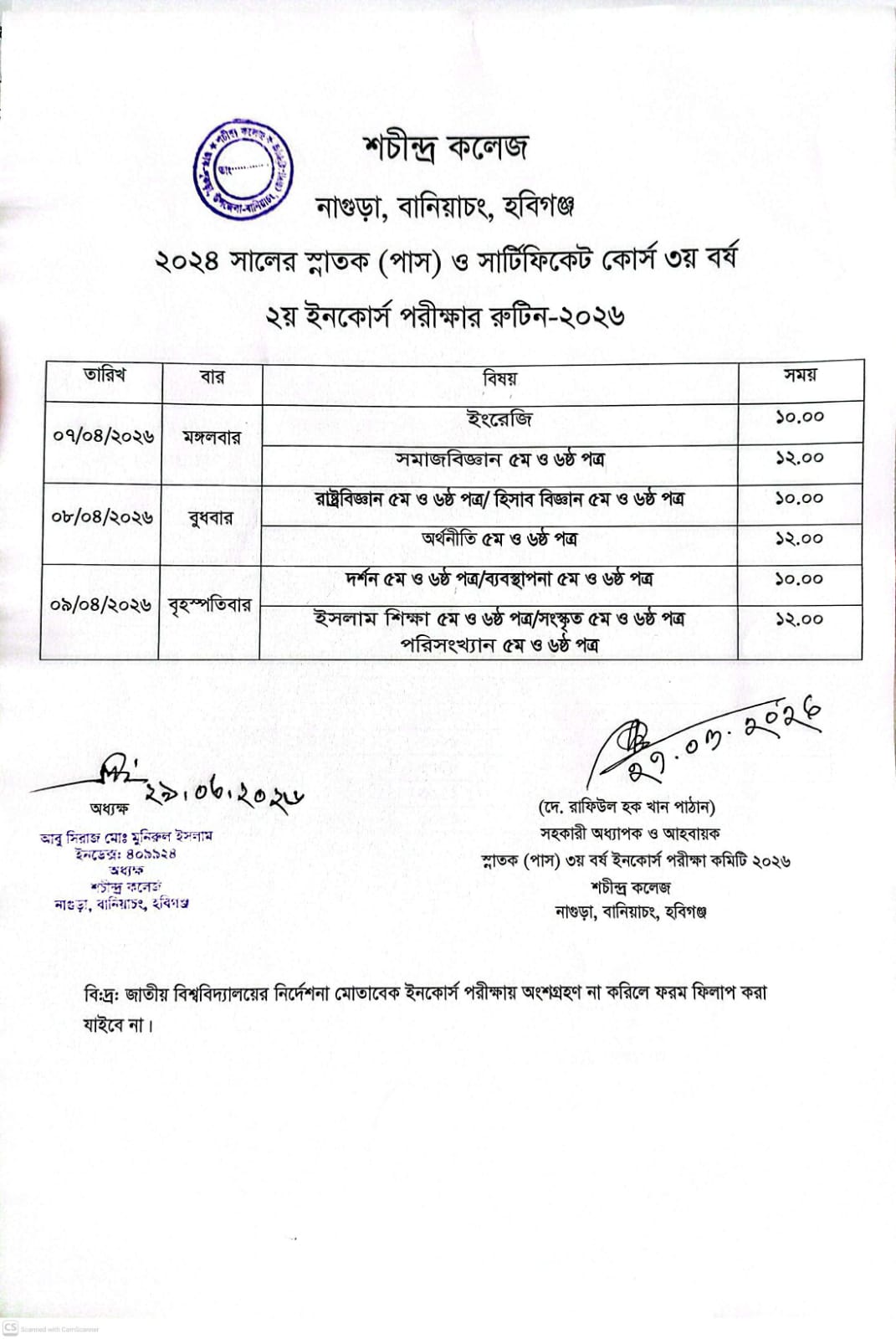 ২০২৪ সালের স্নাতক (পাস) ও সার্টিফিকেট কোর্স ৩য় বর্ষ ২য় ইনকোর্স পরীক্ষার রুটিন-২০২৬