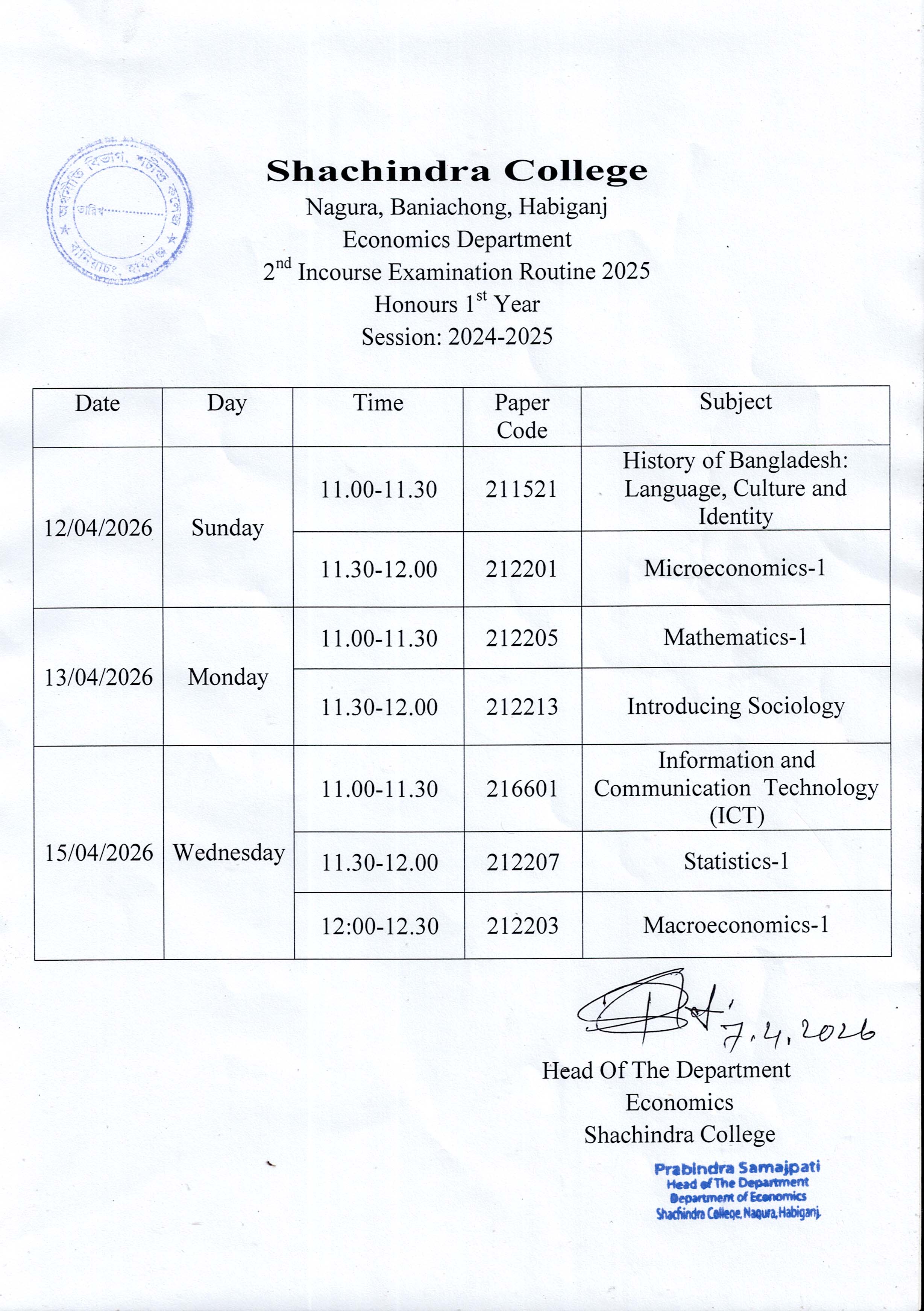 স্নাতক (সম্মান) 2024-2025 শিক্ষাবর্ষের ১ম বর্ষের শিক্ষার্থীদের ২য় ইনকোর্স পরীক্ষার রুটিন